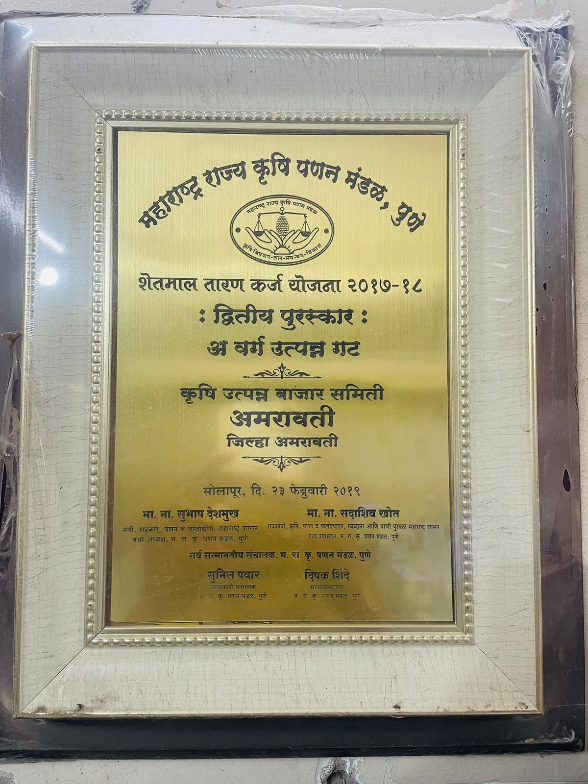 शेतमाल तारण कर्ज योजना पुरस्कार 2017-18 द्वितीय पुरस्कार श्री दीपक विजयकर सचिव अमरावती कृषी उत्पन्न बाजार समिती यांनी माननीय नामदार सुभाष देशमुख यांच्या हस्ते स्वीकारलाहोते.