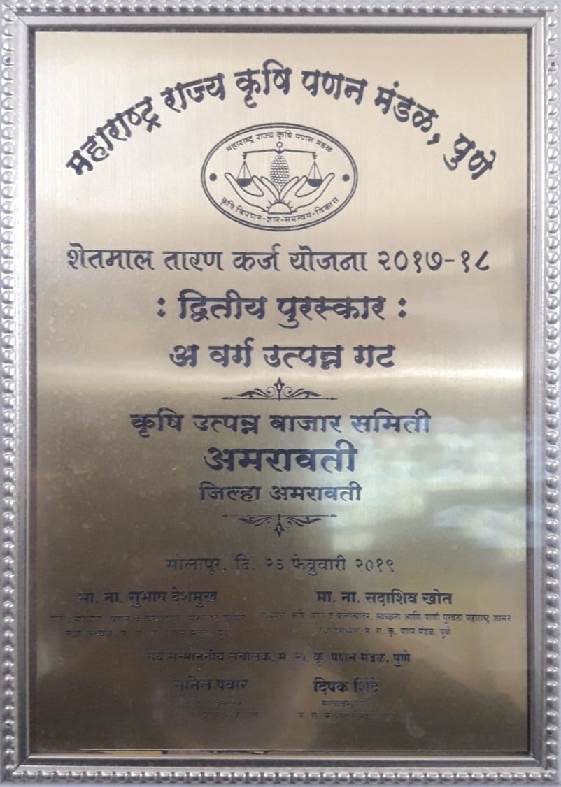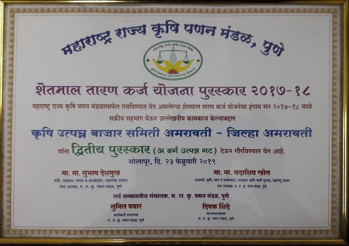 या पुरस्कारासाठी अमरावती कृषी उत्पन्न बाजारसमितीने सक्रिय सहभाग घेऊन उल्लेखनीय कामकाज केल्याबद्दल 2017-18 साली महाराष्ट्र राज्यकृषी पणन मंडळ पुणे तर्फे अमरावती कृषी उत्पन्न बाजार समितीला द्वितीय पुरस्कार (अवर्ग उत्पन्न गट) देऊन गौरविण्यात आले.